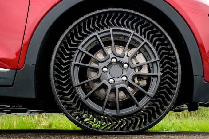 Instead of being filled with air, the tyres have a web of spokes that keep the wheels firm and give them a see-through look.