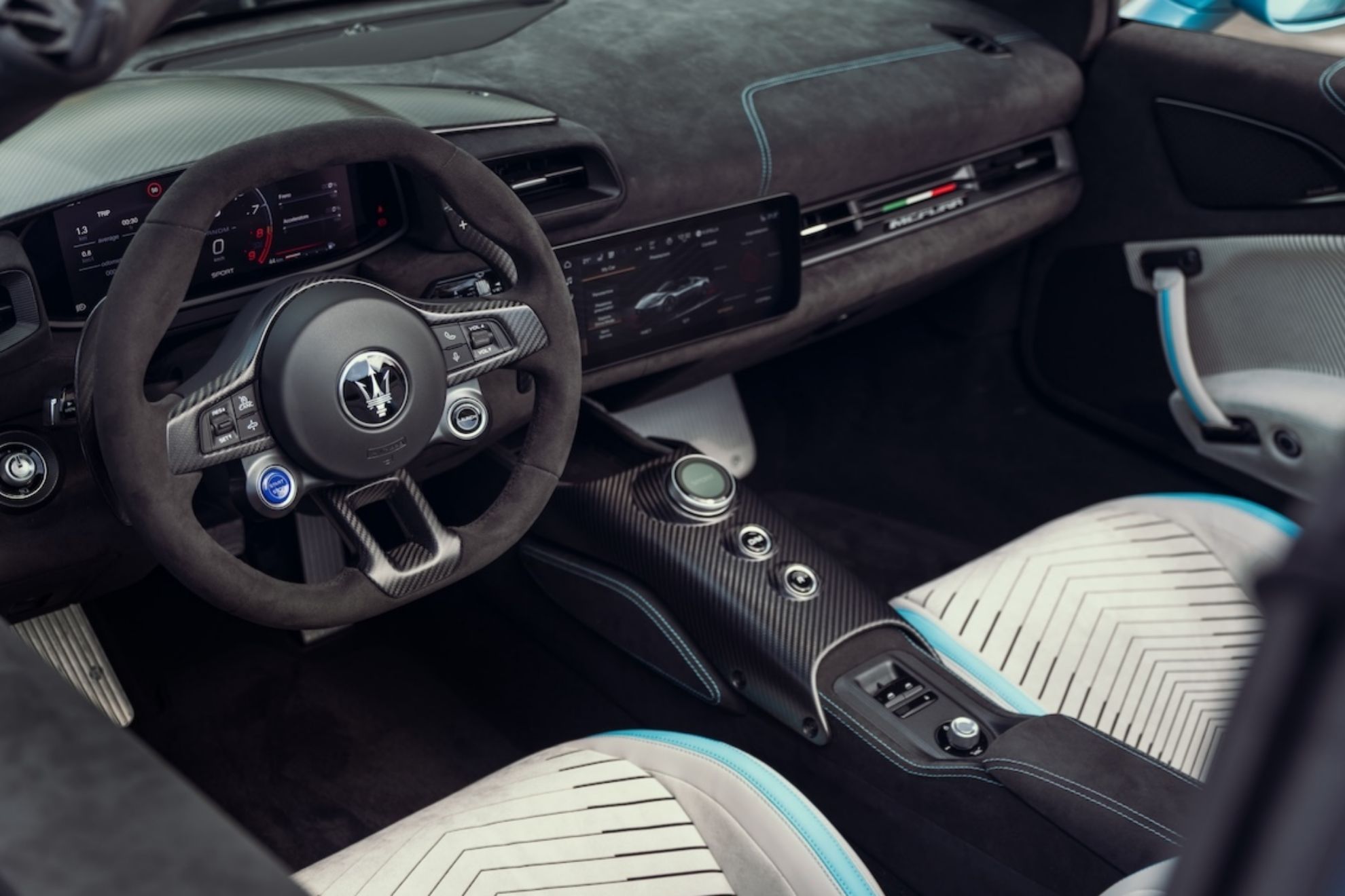 Opening the MCPura's butterfly-wing doors continues to be a spectacle. You're greeted by a simple interior, with Alcantara covering the seats, doors, and dashboard. Maserati decided to forgo traditional leather in favor of a lighter, more technical material with greater grip. Every surface has a purpose; there are no superfluous lines or unnecessary embellishments.